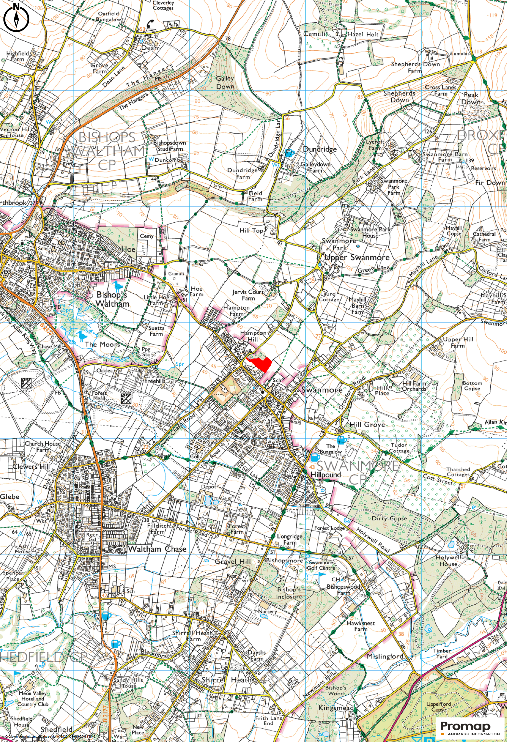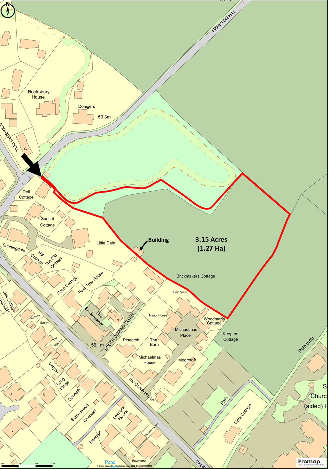 An attractive 3.15 acre (1.27 ha) parcel of pastureland with woodland edges, in the village of Swanmore. Level ground with water supply (currently turned off). Accessed via a track from Hampton Hill. Suitable for agricultural, equestrian, amenity, recreation and conservation uses, subject to planning.
